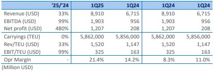 In the first quarter of 2025, revenue of the ocean division of the A.P. Moller Maersk group grew by 33% to USD 8.91 billion. EBITDA and net profit increased by 99% and 480% respectively, to USD 1.90 billion and USD 1.20 billion.