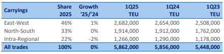 During Q1 2025, overall freight rates were 2% higher than in Q1 2024. Along East-West corridors there was an 8% reduction, but this was more than compensated for by significantly higher rates on the North-South and intra-regional trades.
