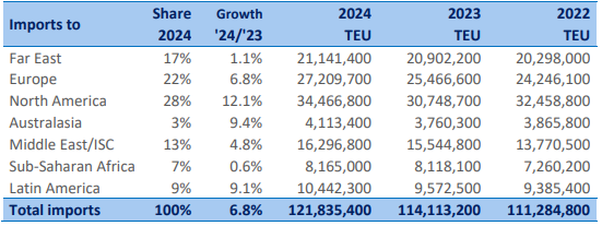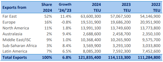 After a sound growth in 2024 and the first month of 2025, in February, worldwide seaborne container trade suddenly contracted by 0.7% to 28.4 million TEU, most probably caused by the US trade tariff measures. Interestingly, it was not US imports, still growing 2.4%, but US exports (-12%) that took a big hit. Probably, importers have brought forward their shipments to avoid potential import taxes. The overall Europe trade shrank in both directions by around 3.5%. In total, thirty of the forty-nine specific trade lanes saw negative developments.